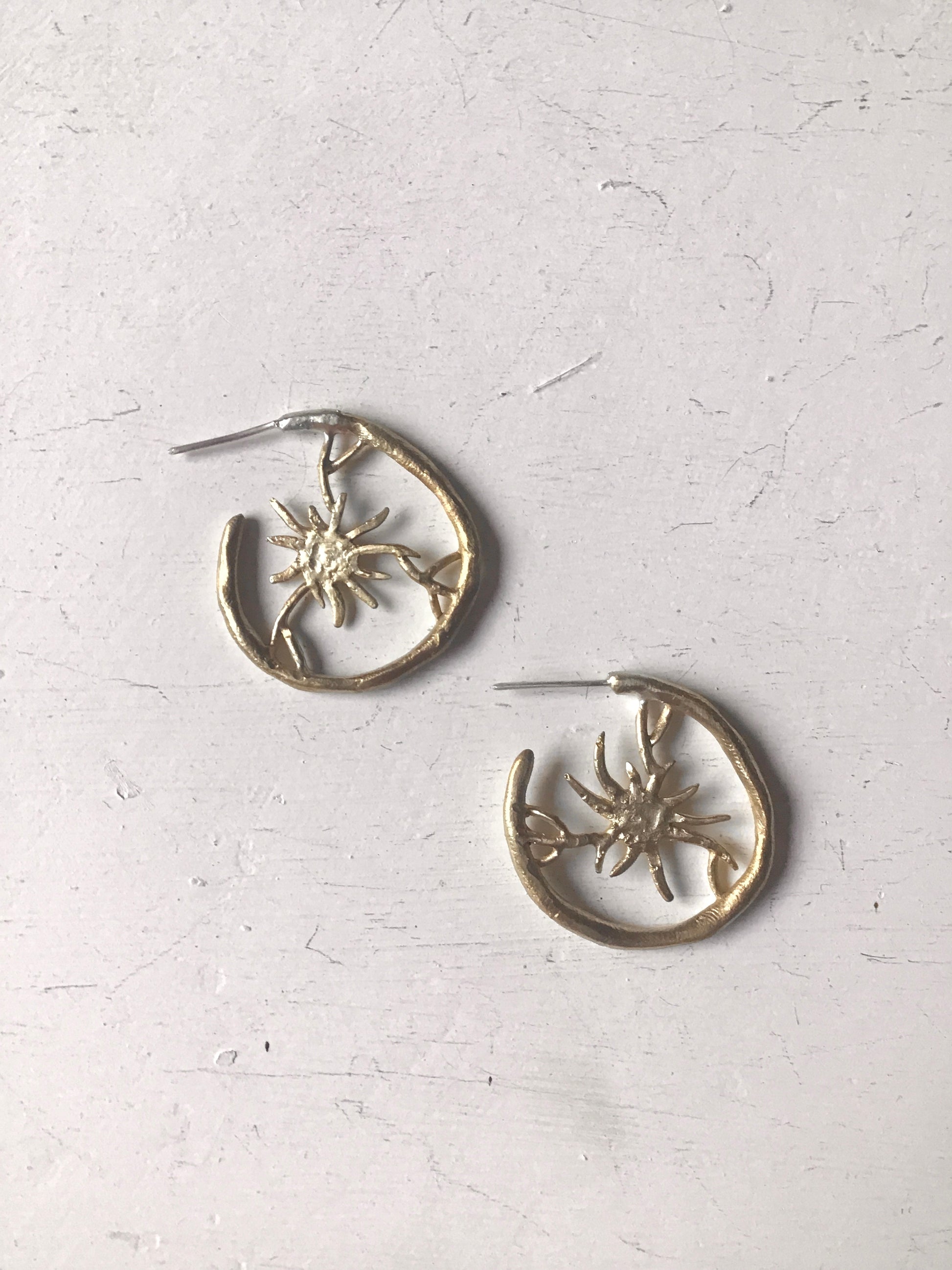 two brass hoop earrings with fire star in the middle rooting out. silver posts and silicon backs