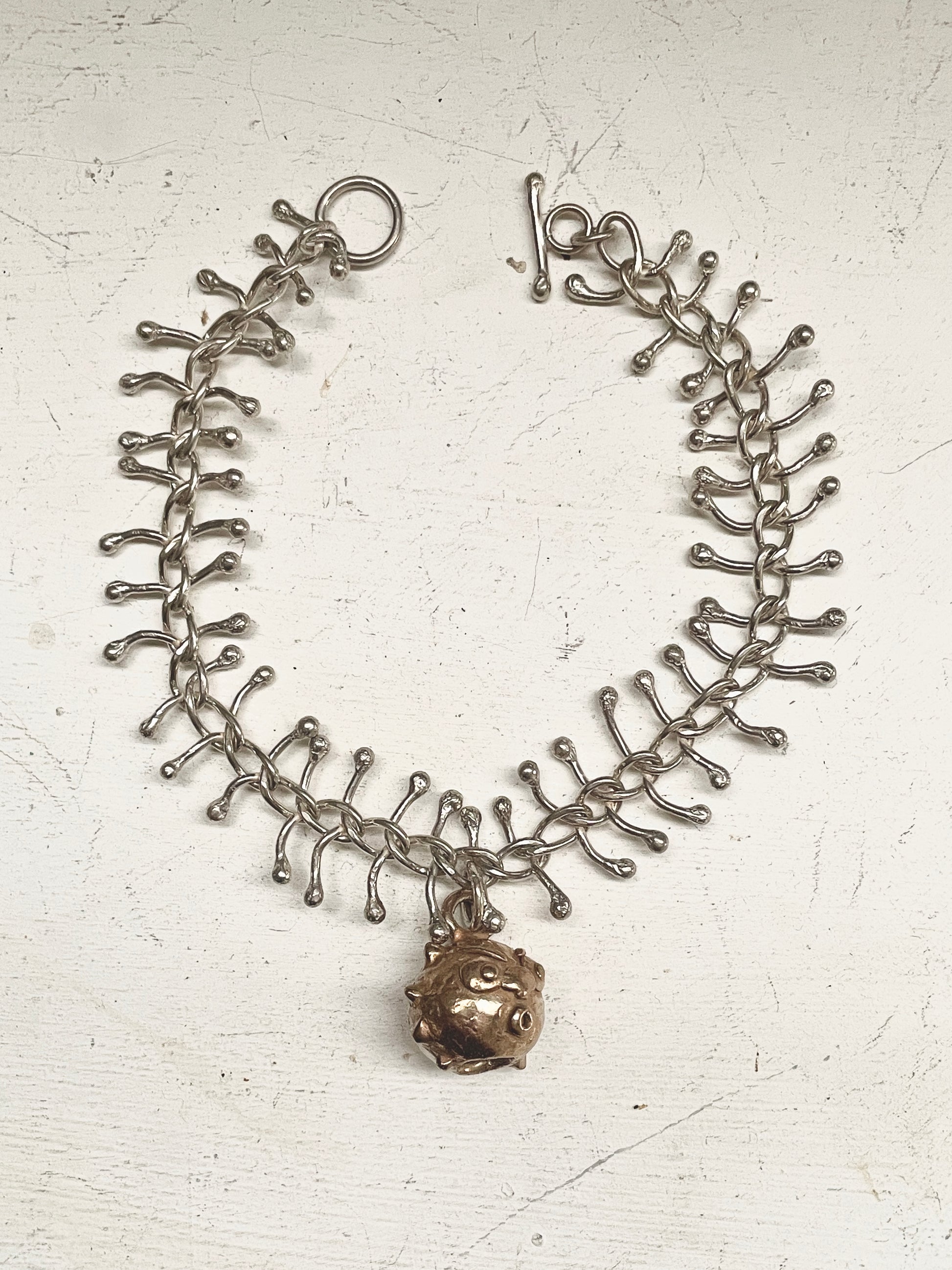 hand forged silver bracelet in the classic fishbone chain, with a spiky grumpy goblin bronze bell dangling