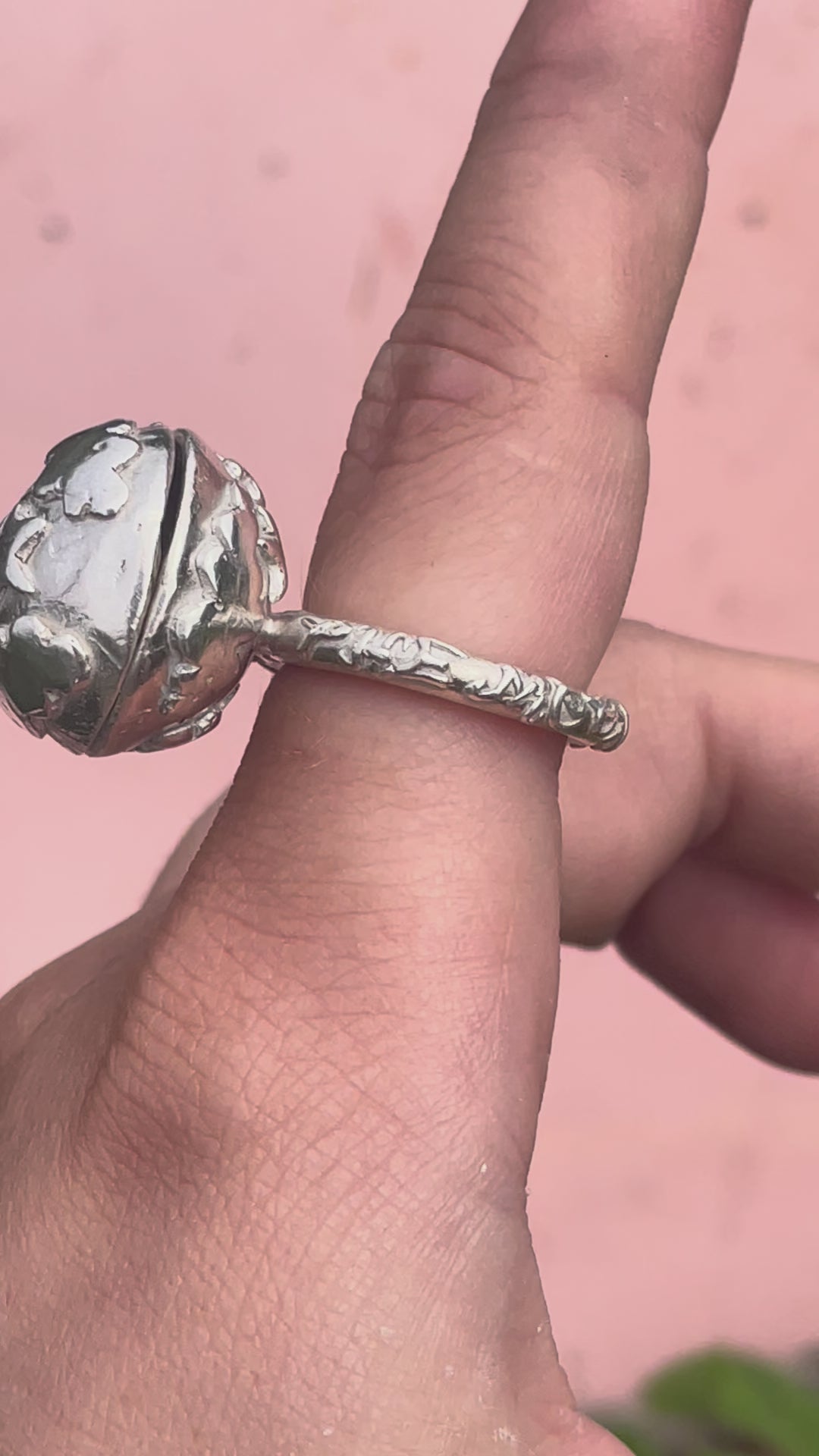 the ring is held shut with two magnets, they hold it closed but not super strong so it opens with a fast hand movement & as you can see in pics, there are wobble gaps (so I don't recommend storing things too precious inside!)