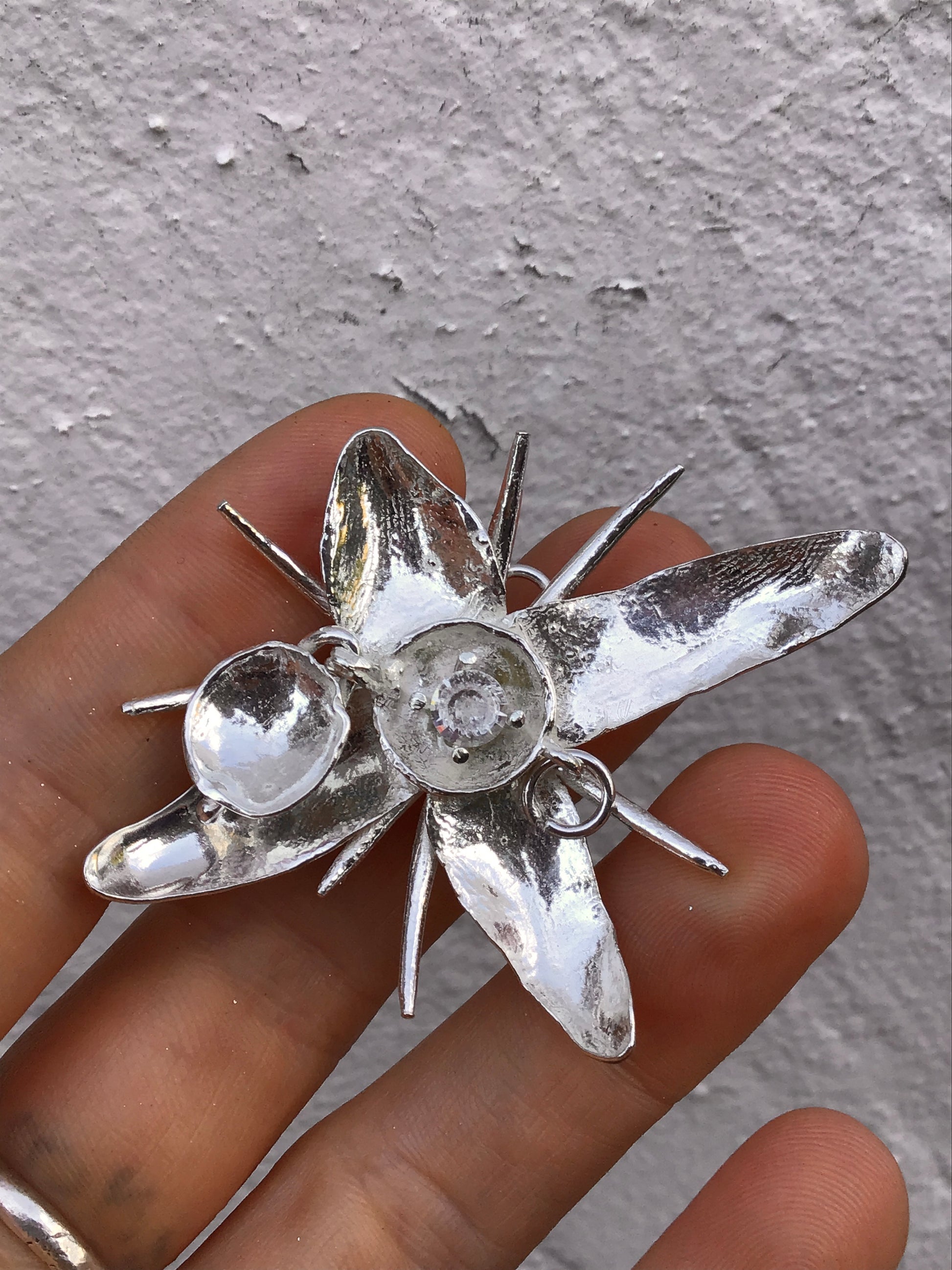 spiky flower piece with a white cubic zirconia found on a bathroom floor set inside tiny locket