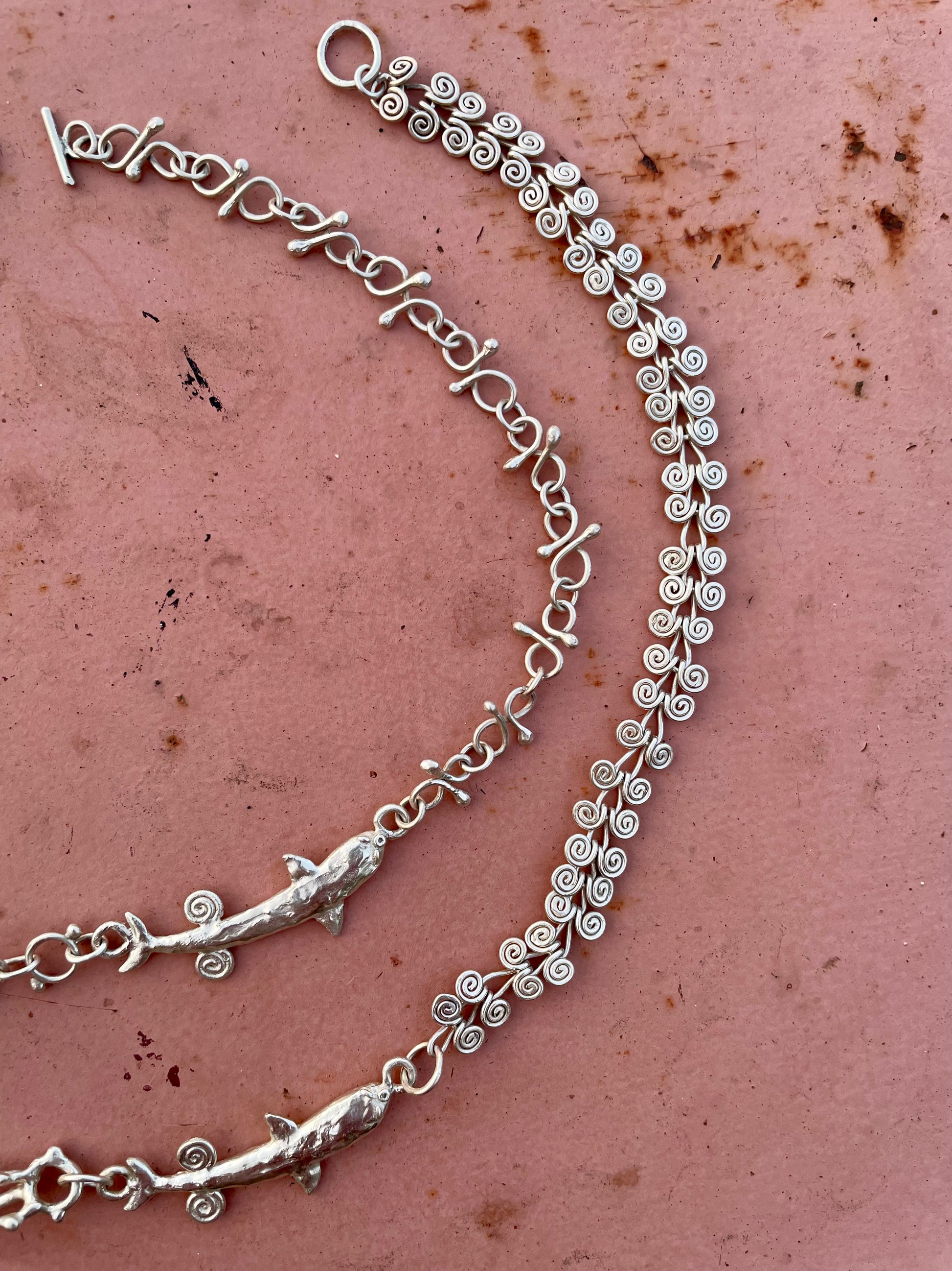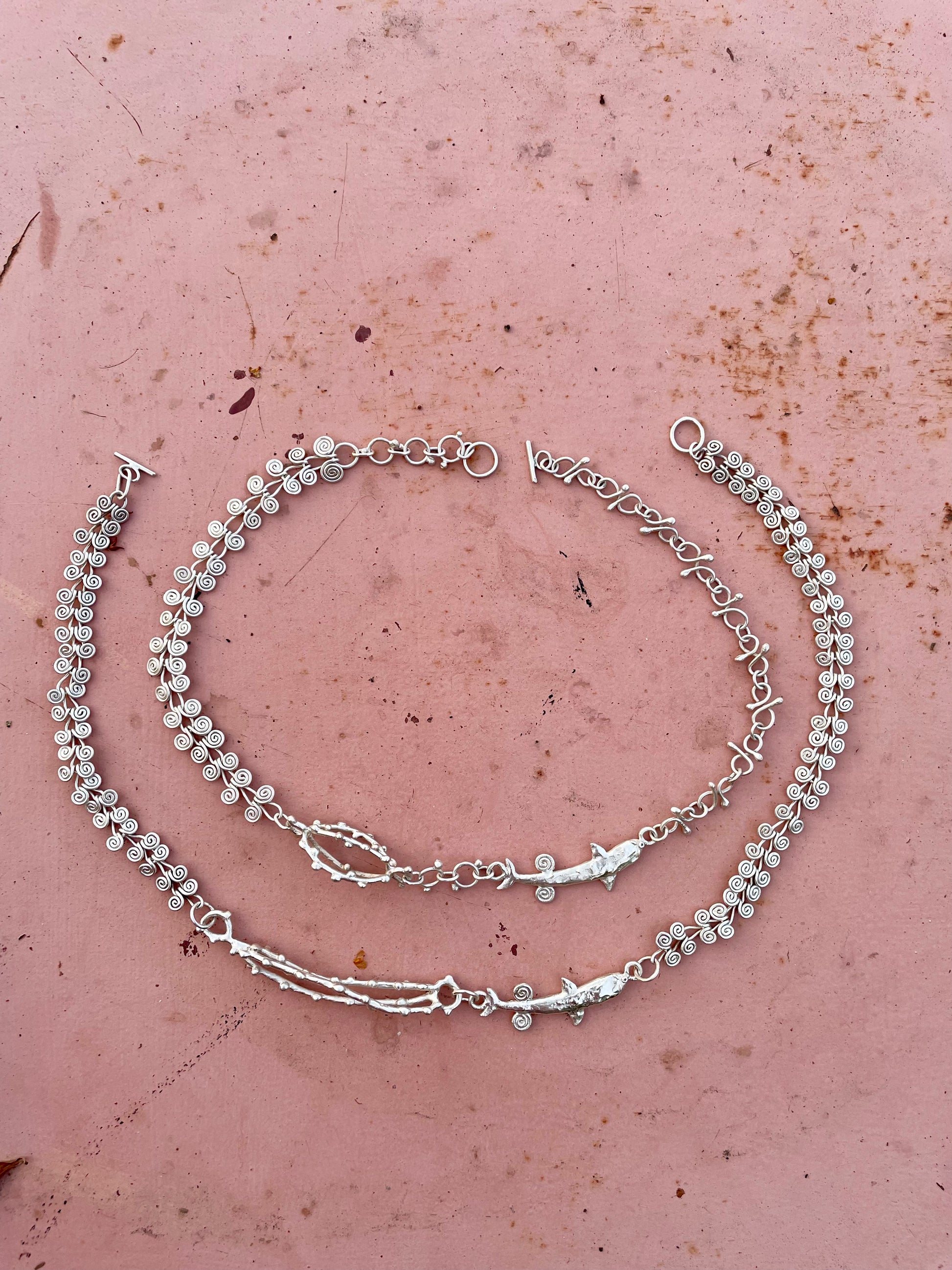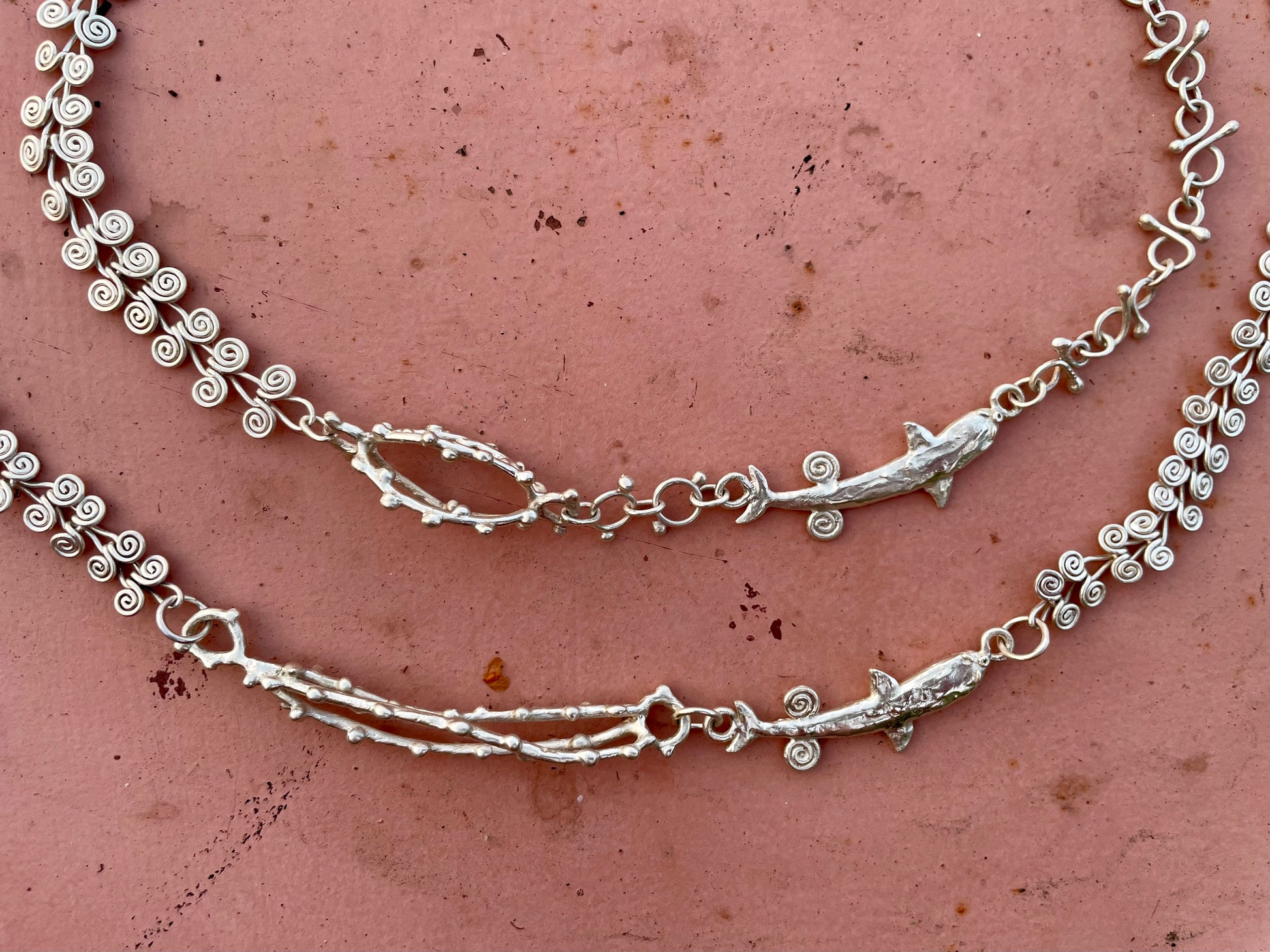two different unique necklaces inspired from the water that surrounds where i live, patterns of flow and ripples and fishes