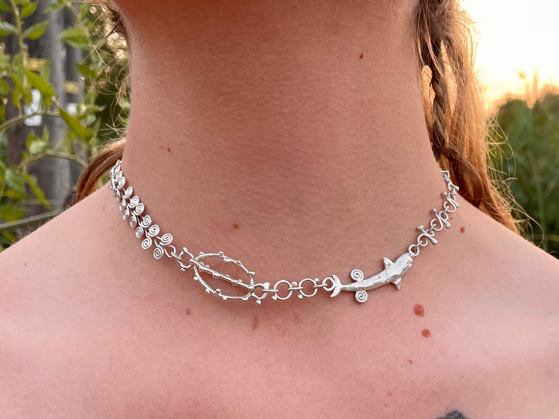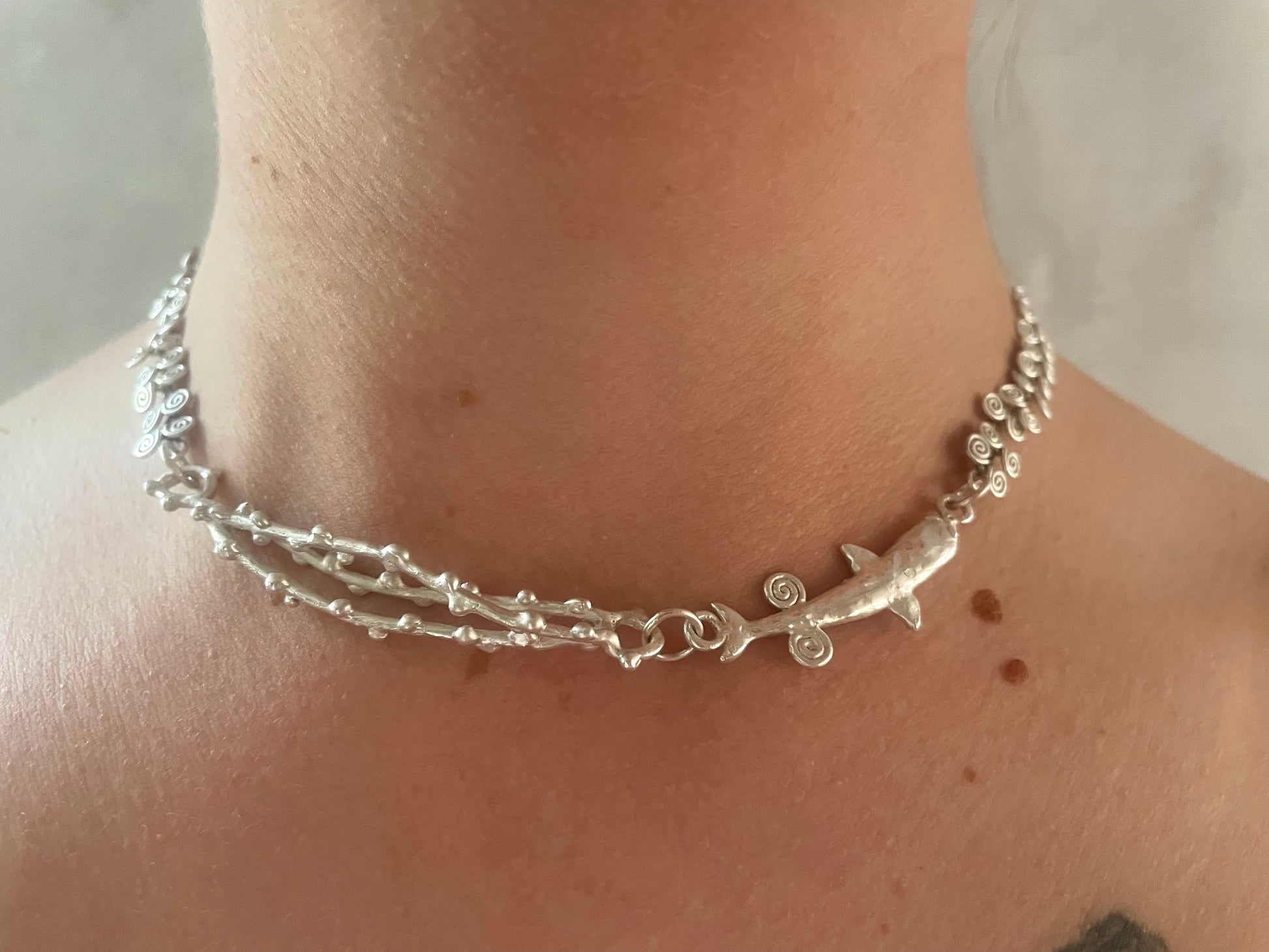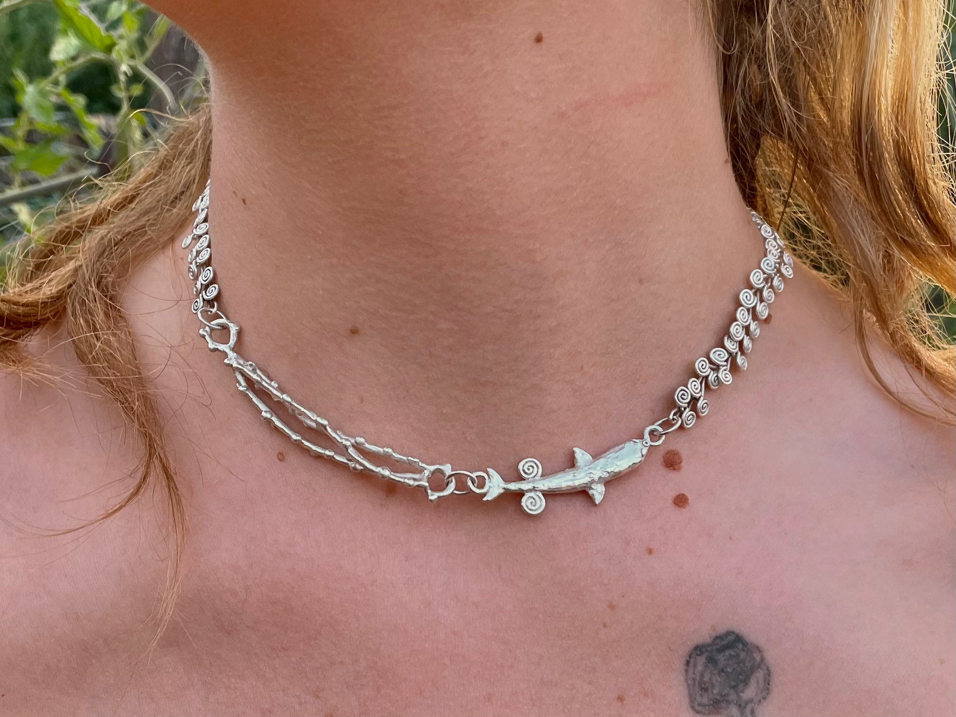two different unique necklaces inspired from the water that surrounds where i live, patterns of flow and ripples and fishes