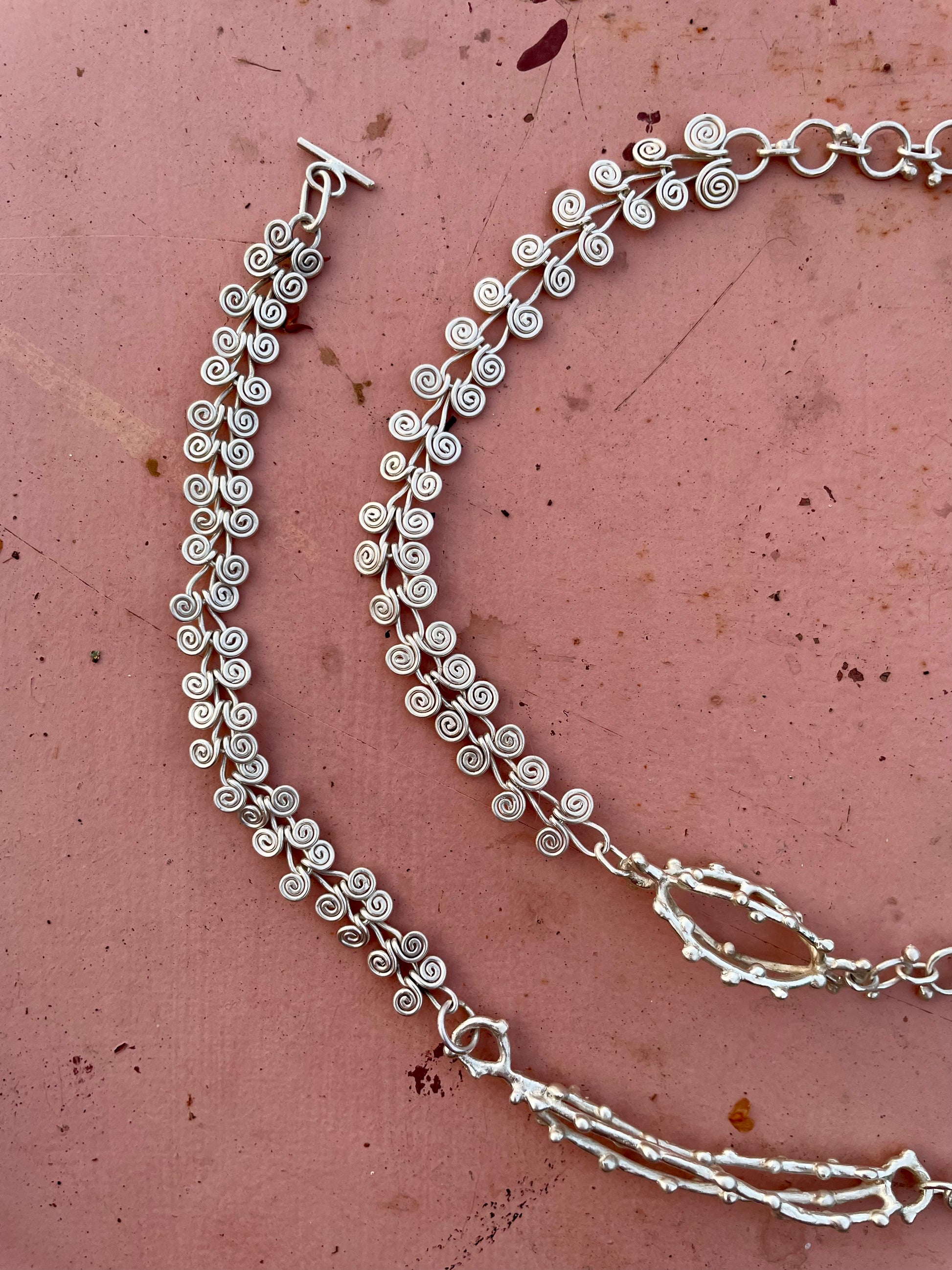 each featuring two cast pieces, fish and water bubbles, and handmade chain - spirals, and infinity droplet chain, with a toggle clasp
