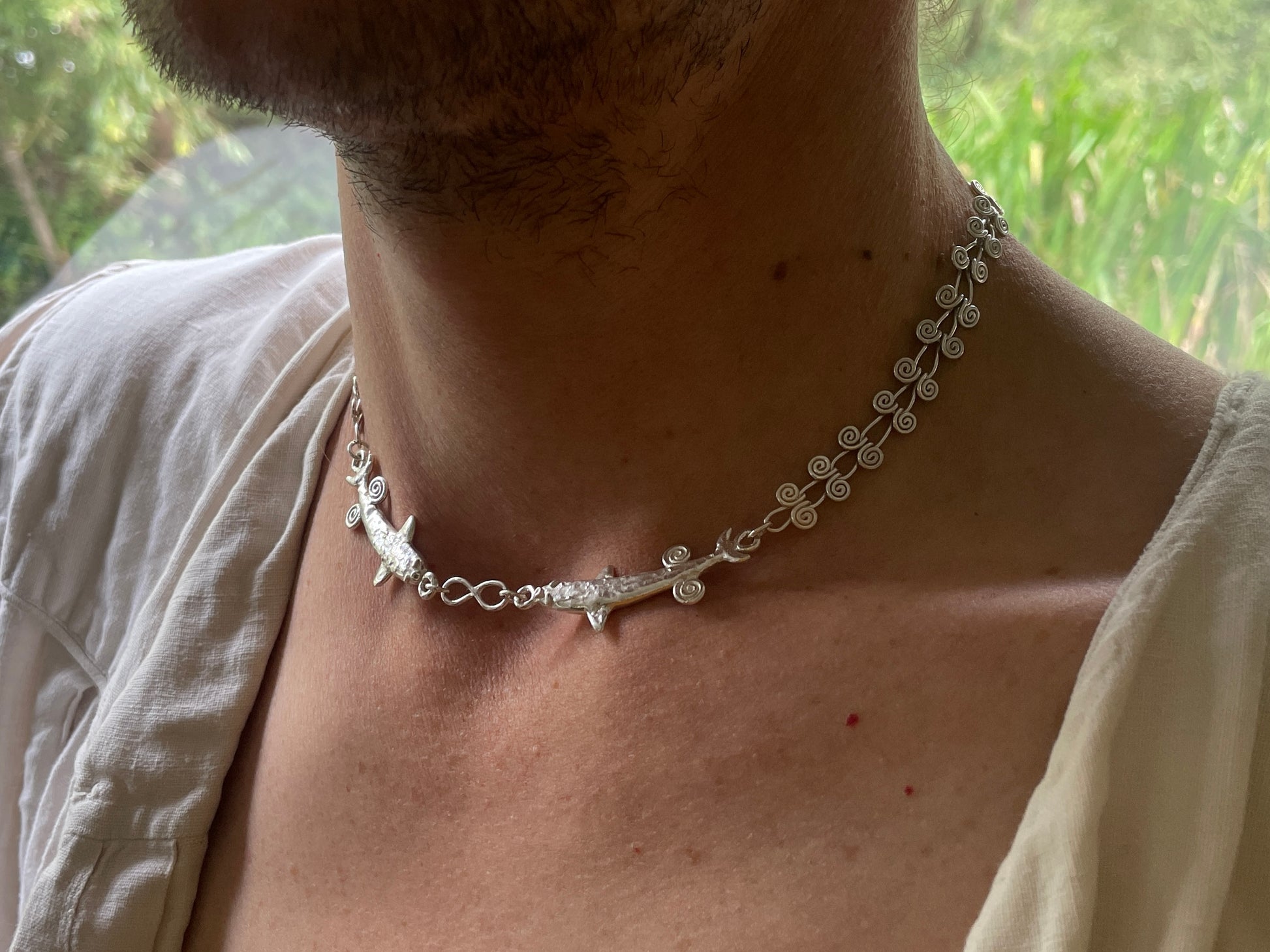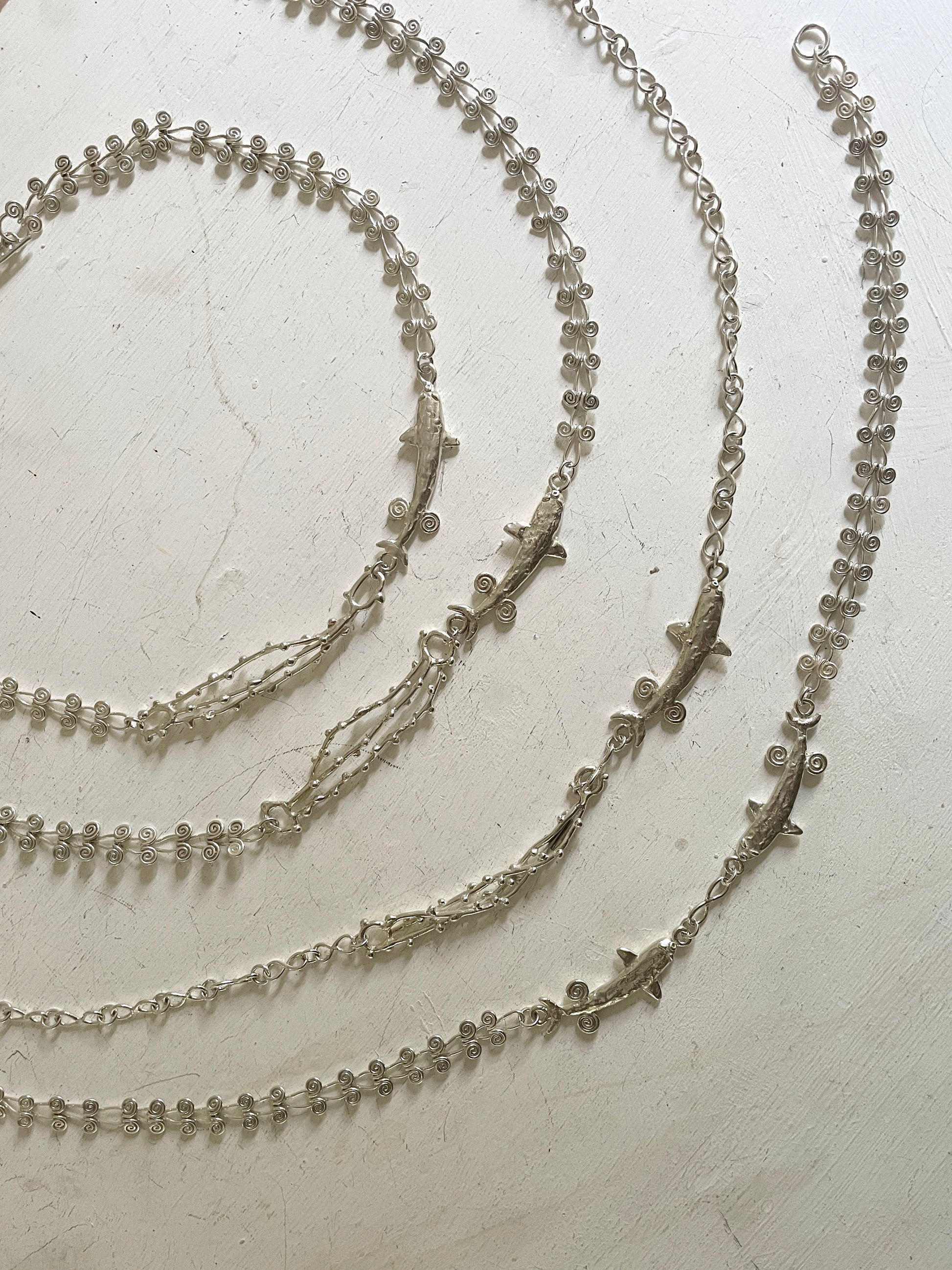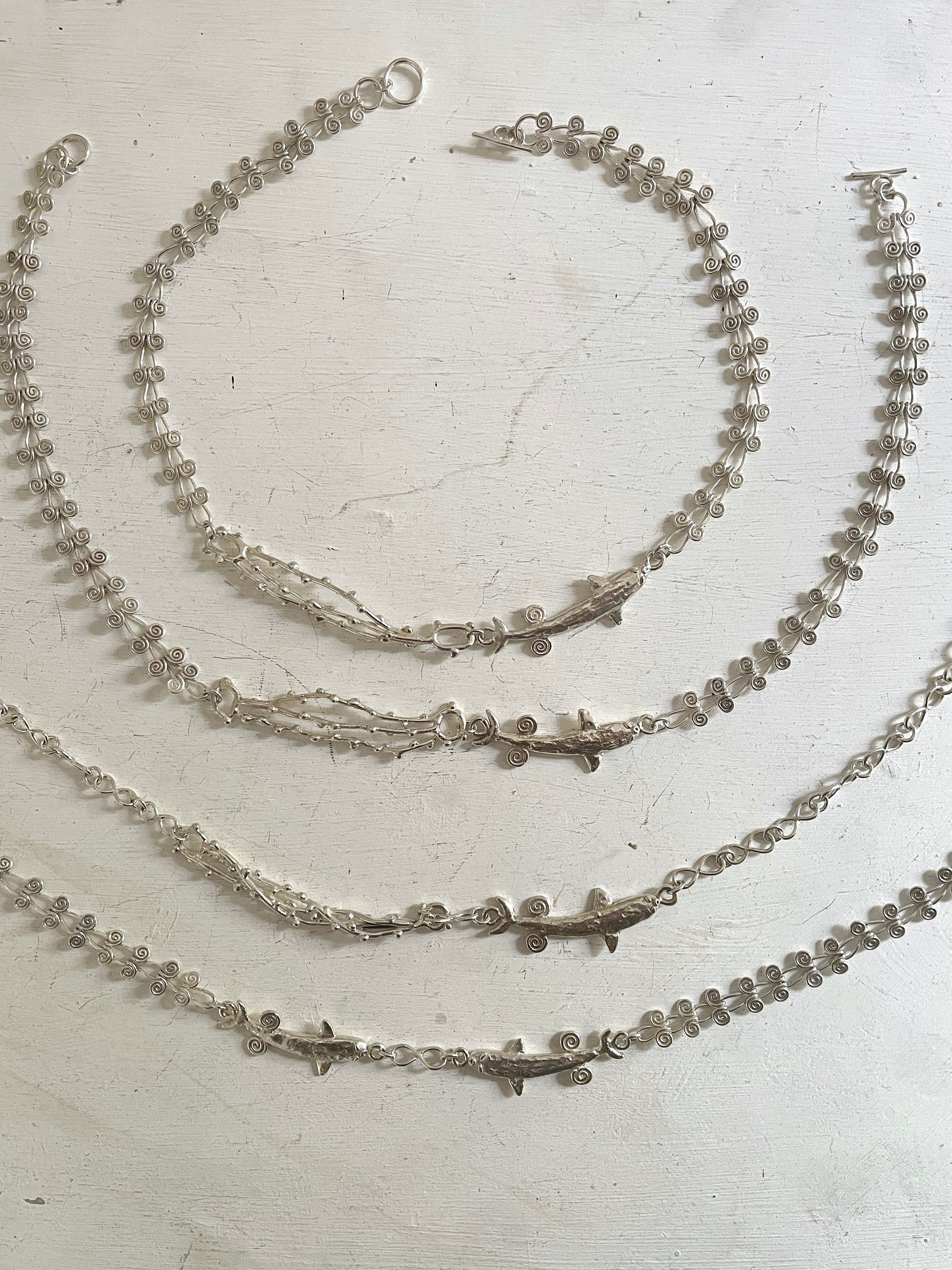 each made from recycled sterling silver with handmade chains, and lost wax cast fishes and bubbles, with a toggle clasp