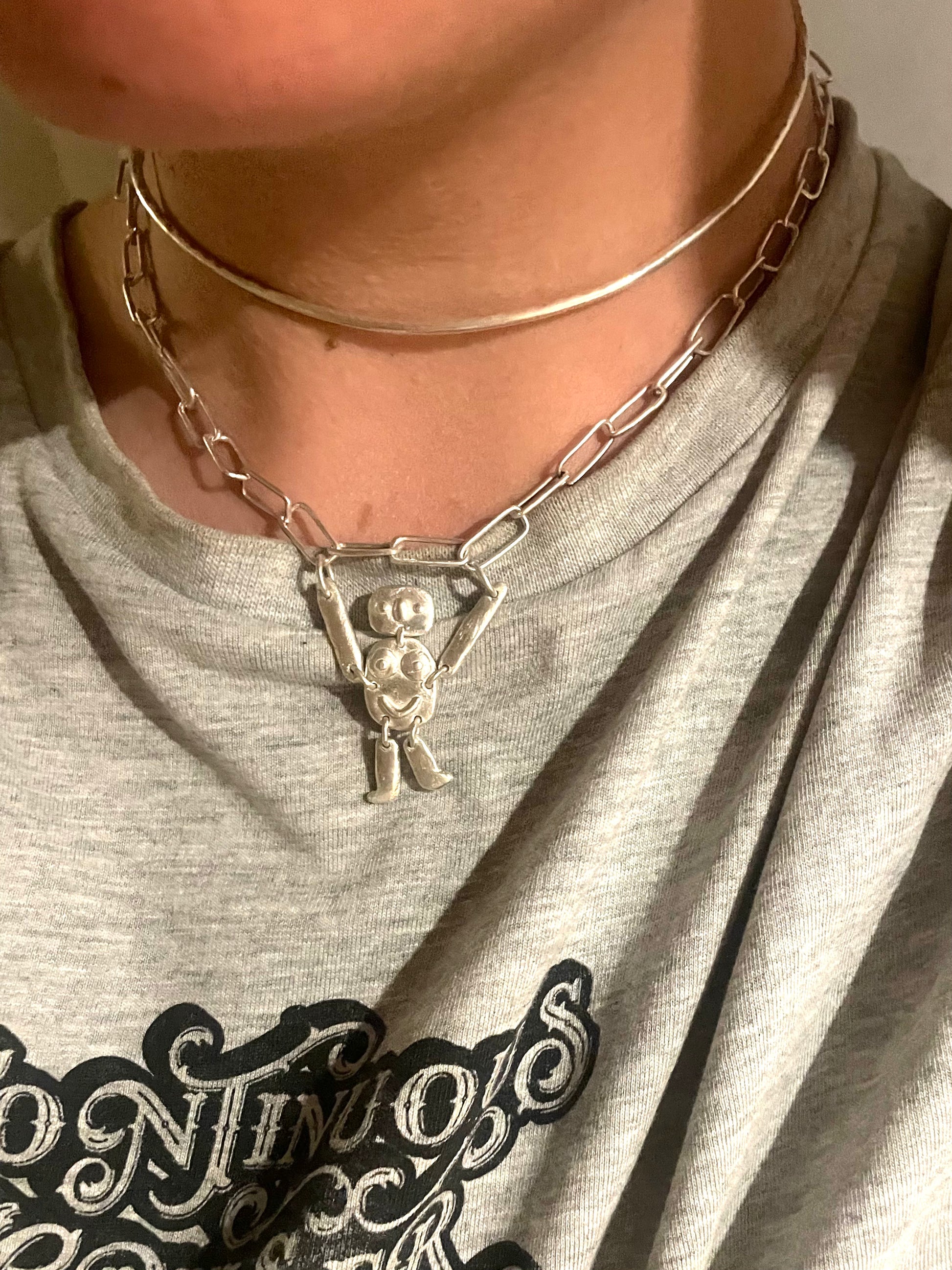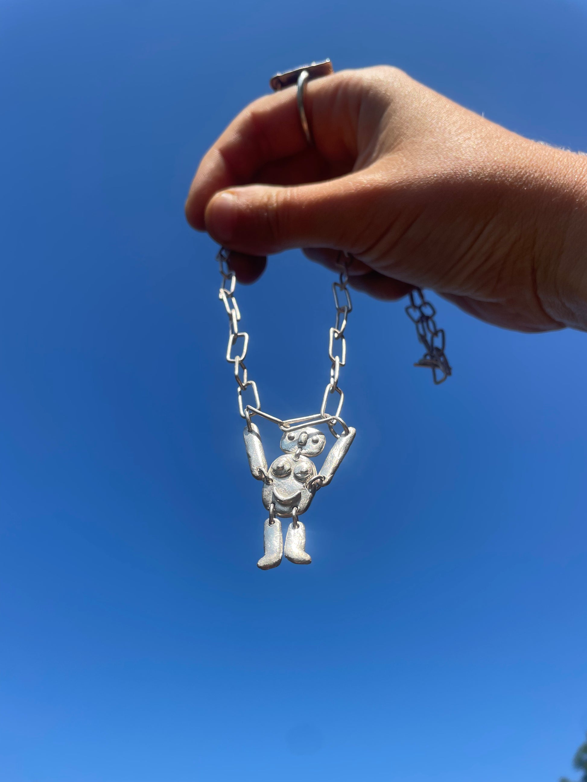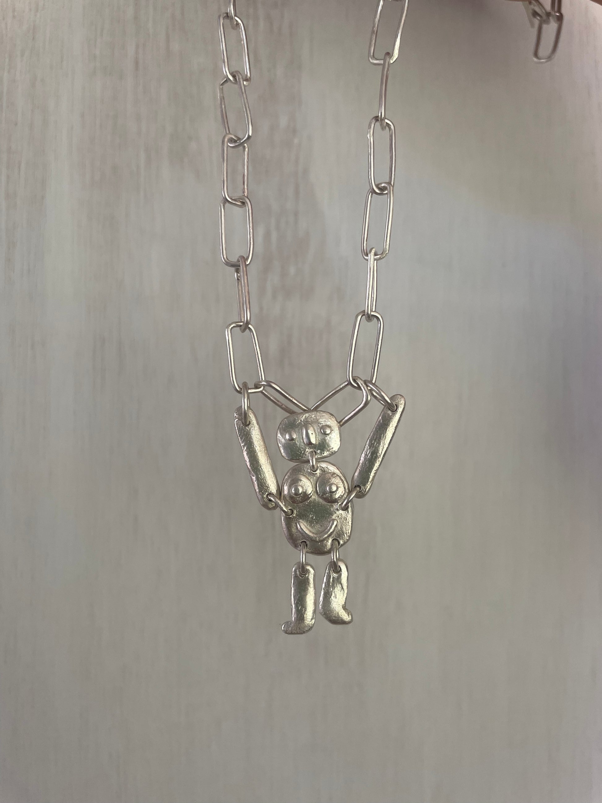 a little kinetic silver person with a happy belly on a light 16" imperfect paperclip chain, fastened with a toggle clasp